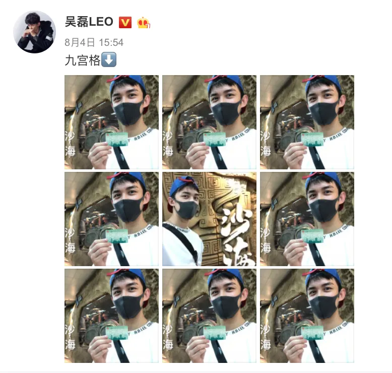 在上海地铁站偶遇吴磊的消息一出,许许多多粉丝都在微博喊话吴磊快把自拍交出来。随后,吴磊在微博放出自拍,配文“九宫格”。细心粉丝发现,调皮地吴磊的九宫格,其实只有两张照片,大赞其是有趣的灵魂,有梗的少年。